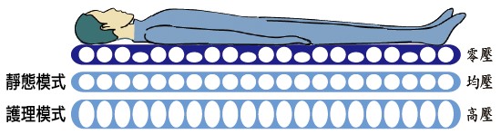 固定時間做充洩氣交替動作,自動改變身體壓力之分佈,以"零壓方式"作減壓功能。