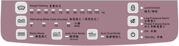 高階全功能數位主機 安全 省電 美觀智慧型床內壓自動軟體監控系統 按鍵式面板純數位化控制 專利幫浦減震結構 交替時間選擇 動態模式、靜態模式、動靜雙模式 按鍵上鎖智慧型功能 操作簡單易懂 貼心易辨識功能符號 主機外殼防燃材質 連續使用一個月電費不到10元 |