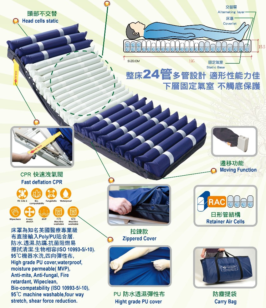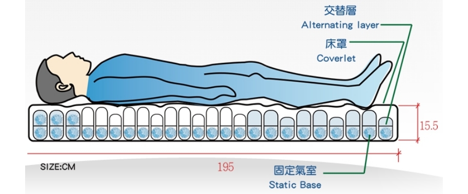 此功能為交替模式,利用改變支撐的軟硬及壓力分佈,得以紓解及預防身體持續壓力帶來的壓瘡。