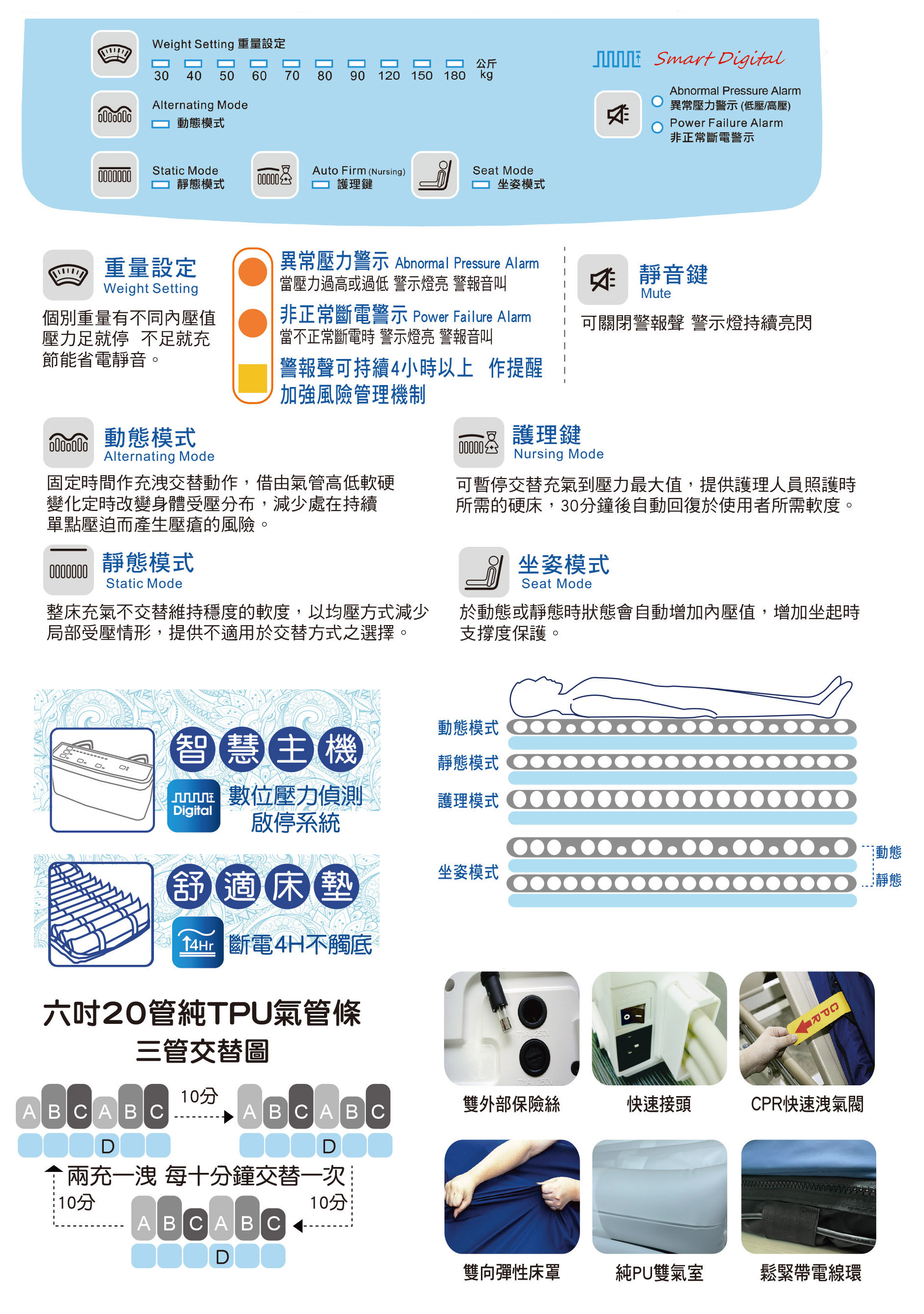 5.坐姿模式 (管條壓力提升且10分鐘交替模式,便於增加床上坐姿時的穩定度)