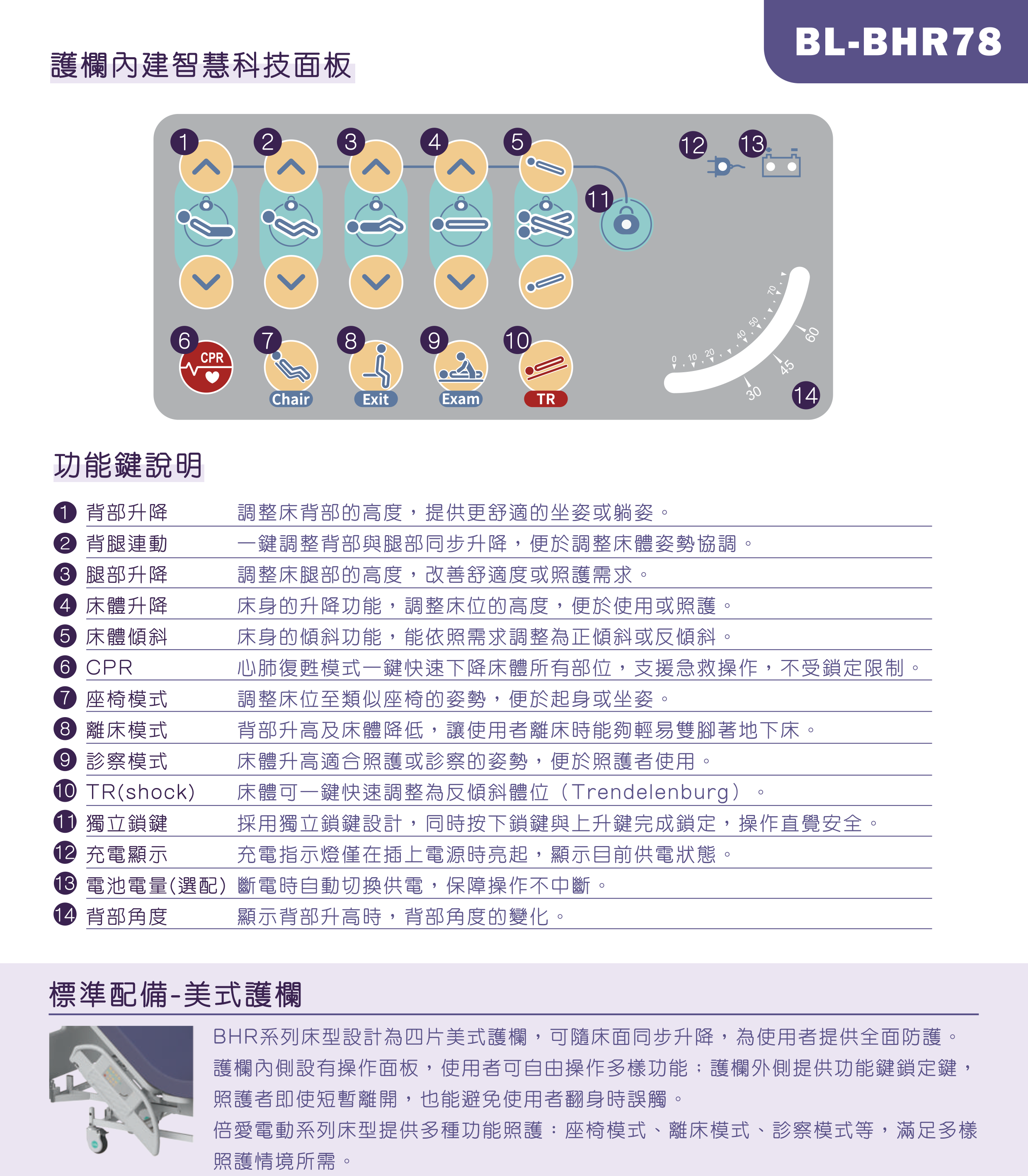 本商品為內嵌式搖控器,頭部護欄內外側皆有控制按鈕,可獨立操作背部升降、