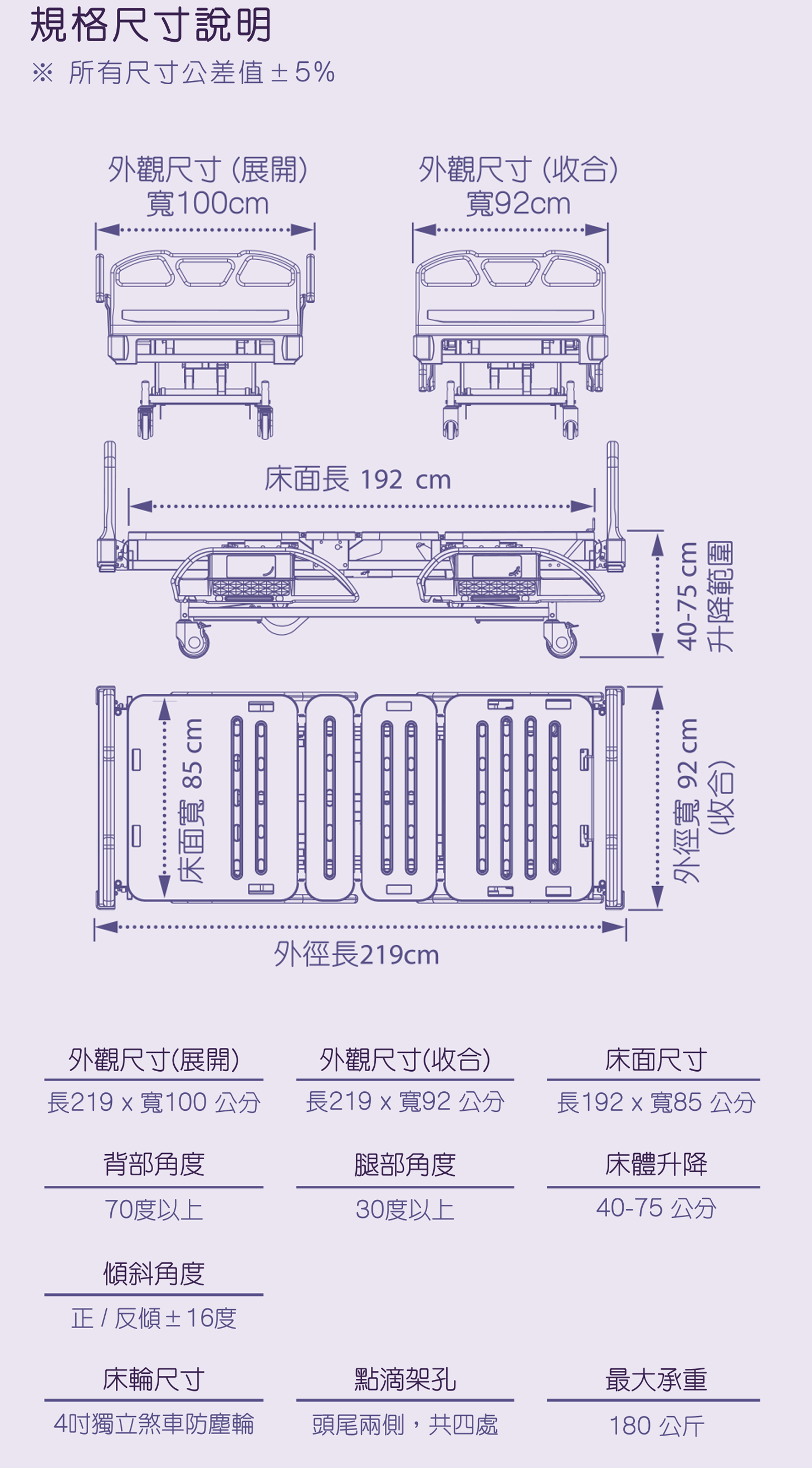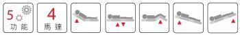 膝部升降、床體高低伸降,並提供背部、膝部同時升降之功能及傾斜角度功能。
