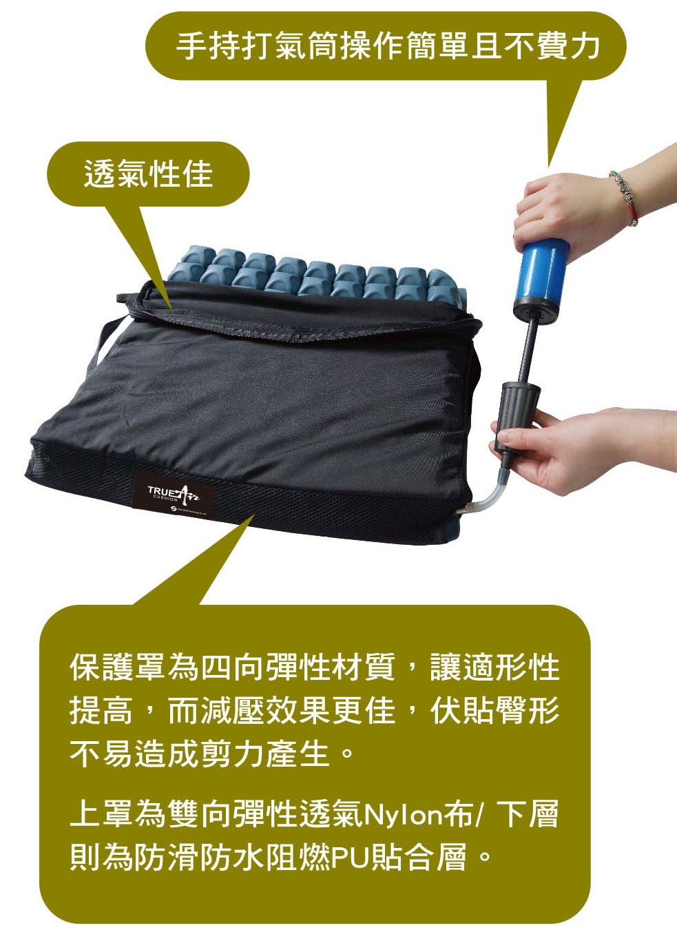 座墊分為單區及雙區獨立氣室,雙區能針對不對稱骨盤做平衡調整。