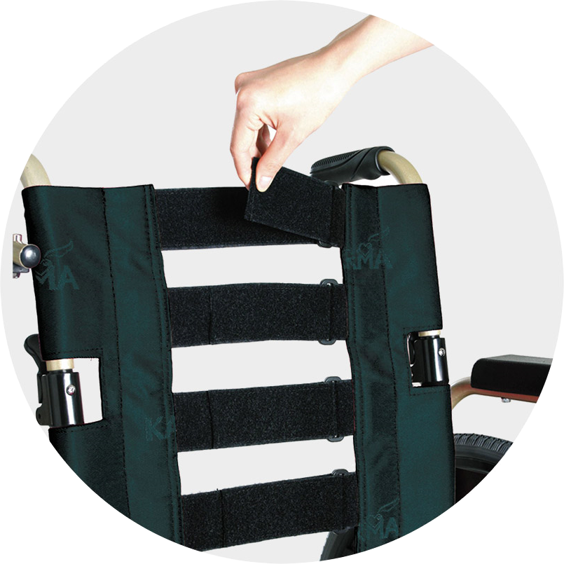 可調式背墊透過強力魔鬼氈設計,可定期將背墊布料重新繃緊,穩定坐姿。
