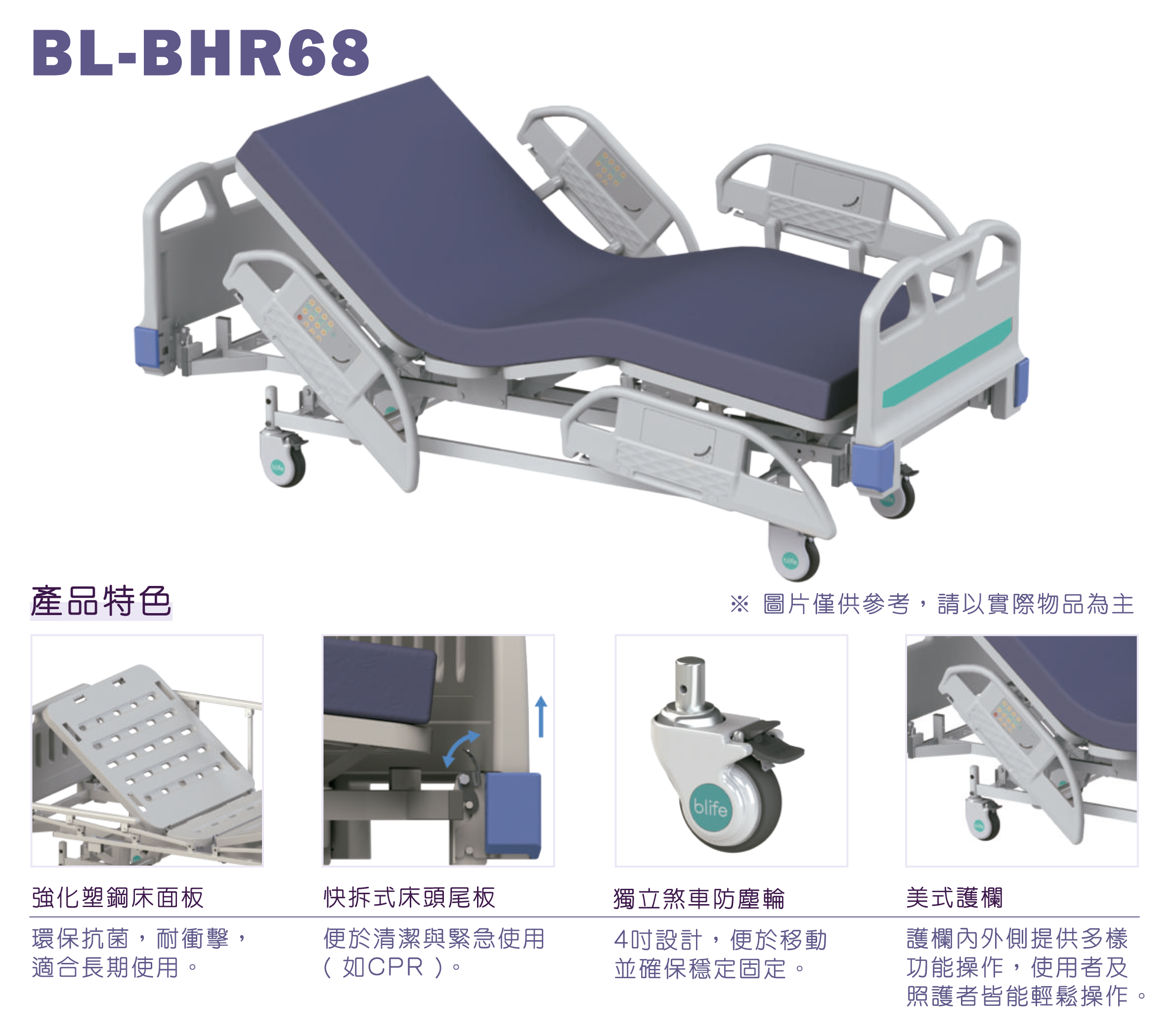• 快拆式ABS床頭尾板,方便洗頭或CPR(如產品圖片)。