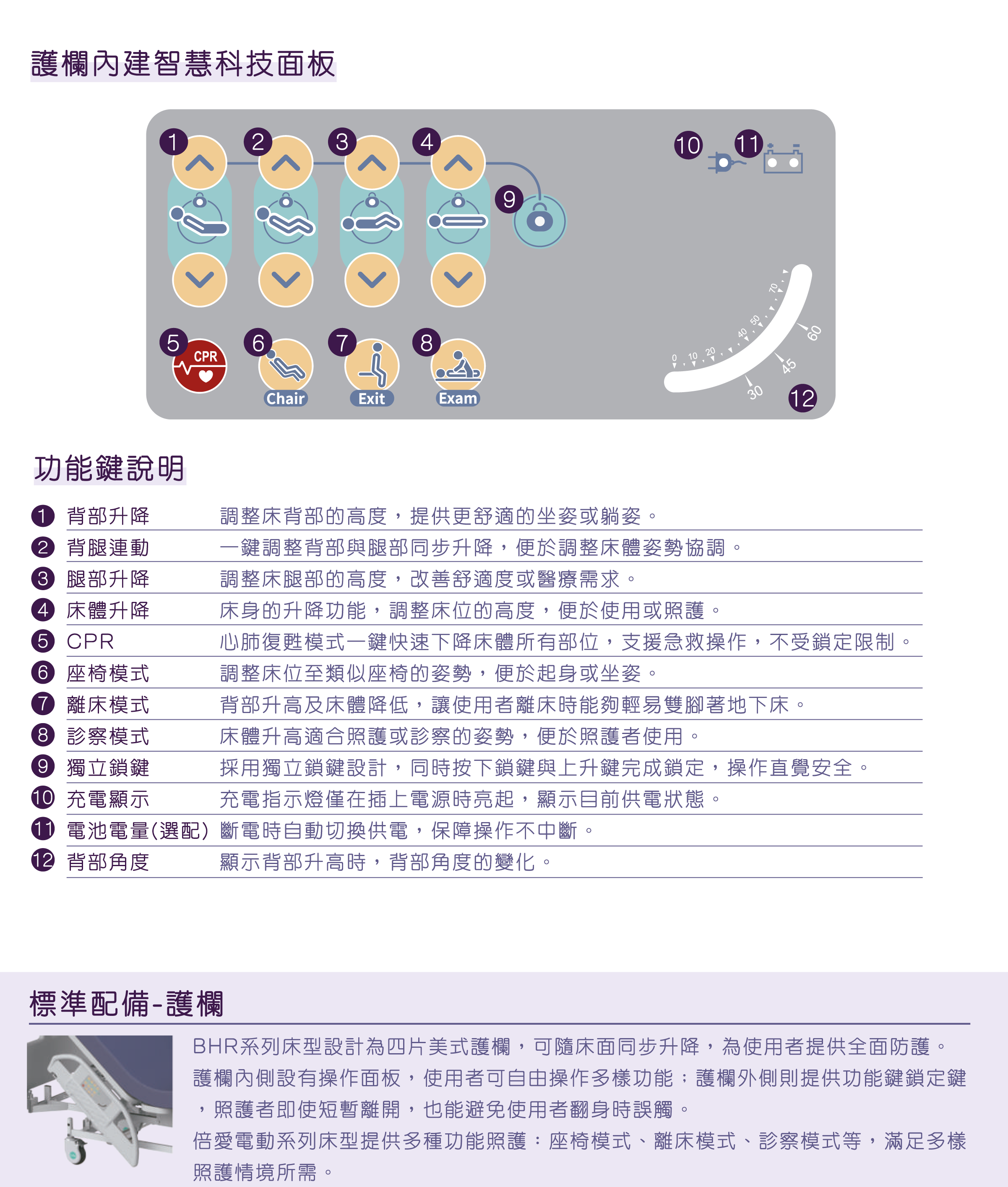 • 本商品為內嵌式搖控器,頭部護欄內外側皆有控制按鈕,可獨立操作背部升降、